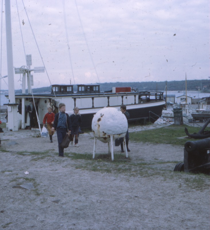Bilderna är från en skolresa till Hallands Väderö med klass fem ht 1970. Bilden föreställer en hamn med en båt vid kajen. Framför den går fyra barn.