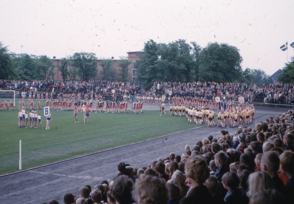 Bilden föreställer Skol J.F. 40 år, 1961. På bild en idrottsplats med fotbollsplan omgiven av löparbanor. På dessa ytor finns barn i olikfärgade idrottskläder, gående i grupper. Vid sidorna åskådare. I bakgrunden träd och byggnader.