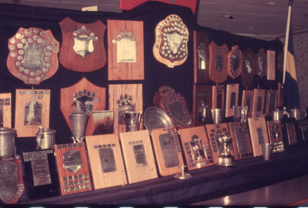Bilden föreställer Skol J.F. 40 år, 1961. På en vägg på en svart bakgrund hänger sköldar med plaketter i metall. Där står också pokaler. Troligen är det olika idrottsvinster. Skölden uppe till vänster finns i samlingen, samt en del pokaler.