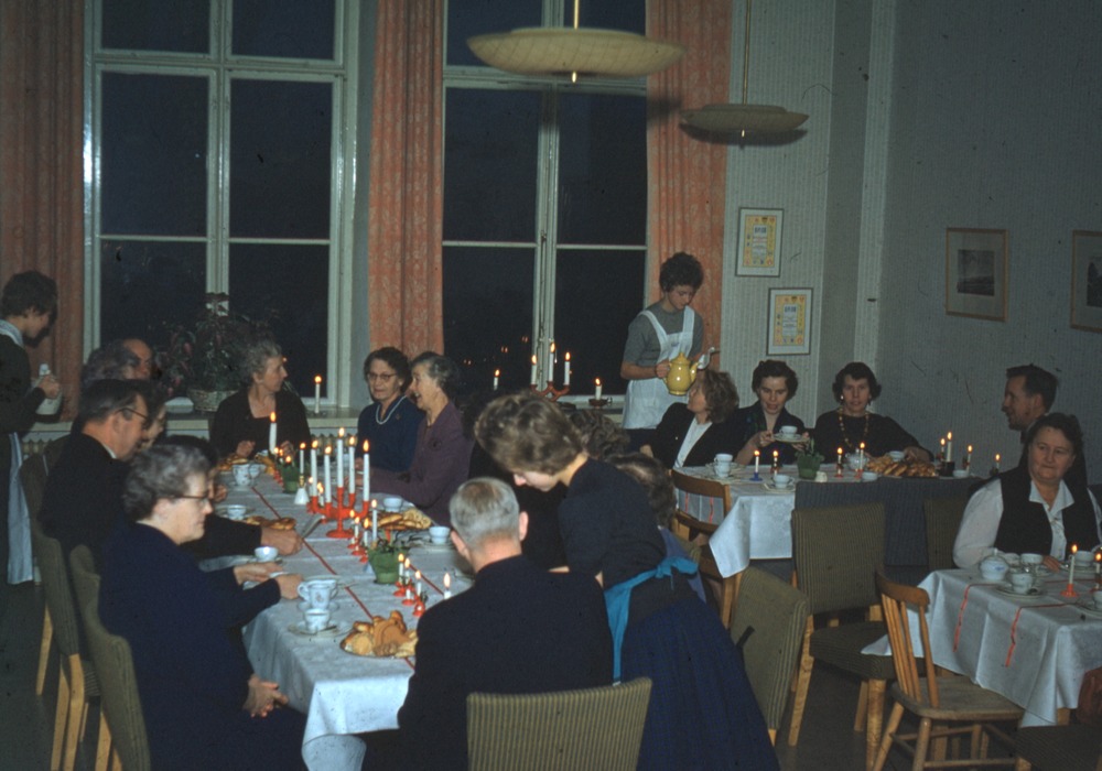 Bilden föreställer Lucia kaffe för kollegiet. I en sal med bord med vita dukar, ljusstakar, kaffekoppar och kaffebröd sitter kvinnor och män. Två kvinnor med vita förkläden serverar kaffe.