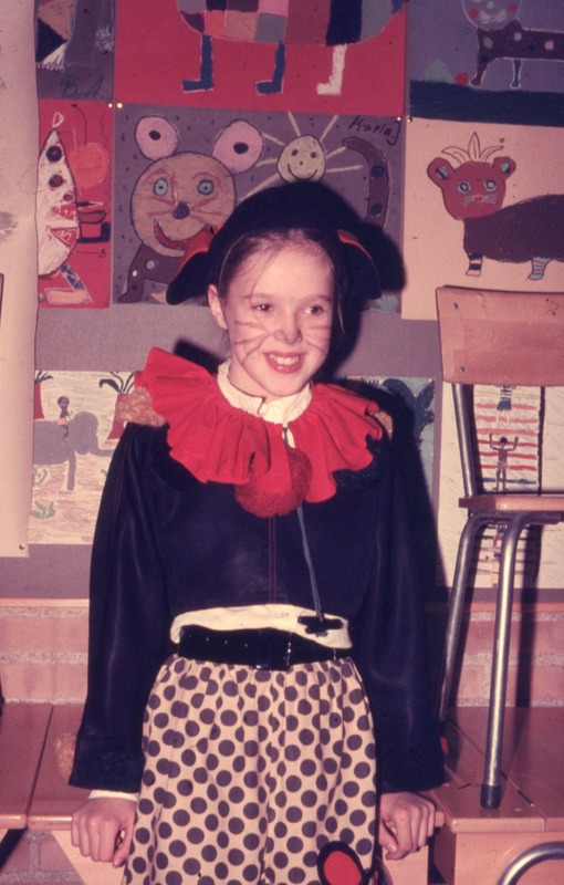 Bilden föreställer klassfest, klass fyra vt 1970. Ett barn utklätt. I bakgrunden vägg med teckningar.