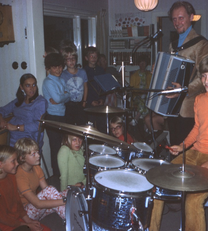 Klass fem ht 1970. Bilden föreställer en interiör. En pojke sitter vid ett trumset, bakom honom en man med dragspel. I bakgrunden sitter och står barn.