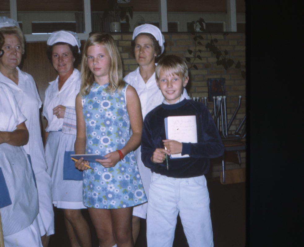 Klass fem ht 1970. Bilden föreställer en interiör. Tre kvinnor i köksklädsel och en flicka och en pojke med penna och anteckningsbok i händerna står inne i en lokal.