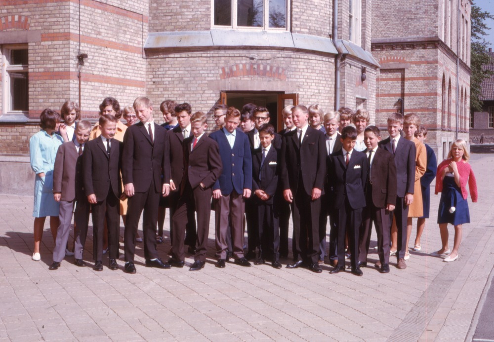 Bilden föreställer ett grupporträtt av klass 7 examen. Ungdomarna är fotograferade på skolgården utanför skolbyggnaden.
