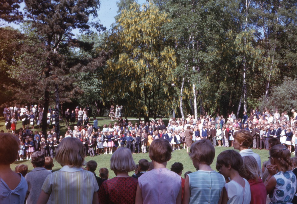 Bilden föreställer skolavslutning, examensavslutning i Grytan för Slottsvångsskolan 1964. I förgrunden barn med ryggen mot kameran. Mitt i bild barn i halvcirkel på en gräsmatta. I bakgrunden träd.