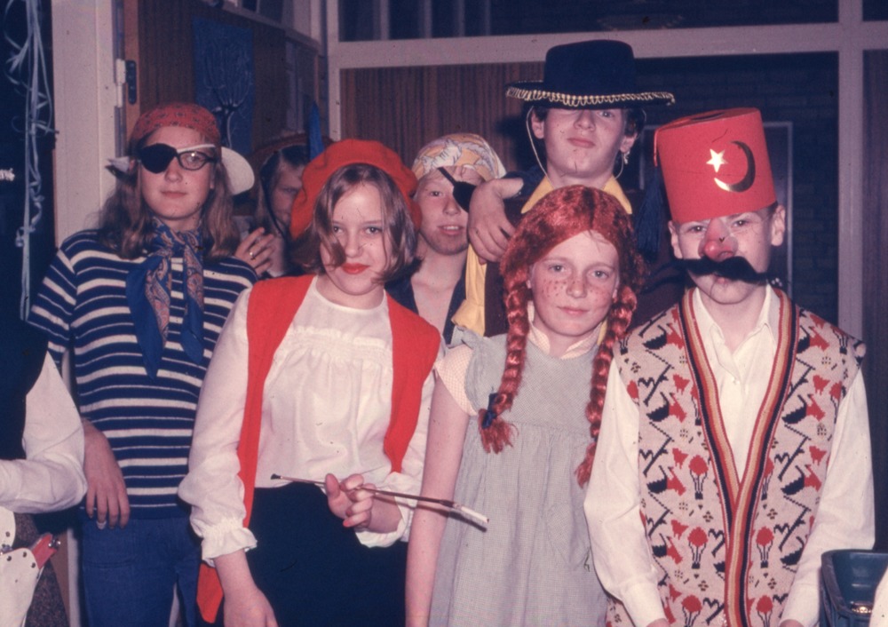 Bilden föreställer enligt register klassfest klass 6 vt 1969. Porträtt på sex barn i halvformat i maskeradklädsel.