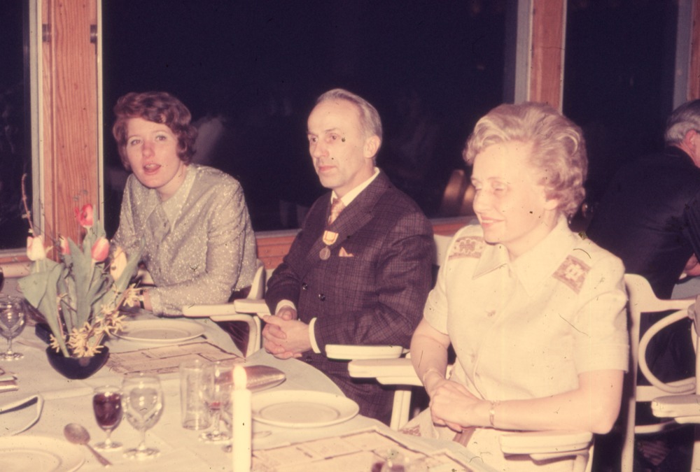 Bilden är från Skol J.F 50 år på Parapeten 1971. Bilden föreställer kvinnor och män som sitter vid dukade bord med vitadukar, blommor, ljus och servis.