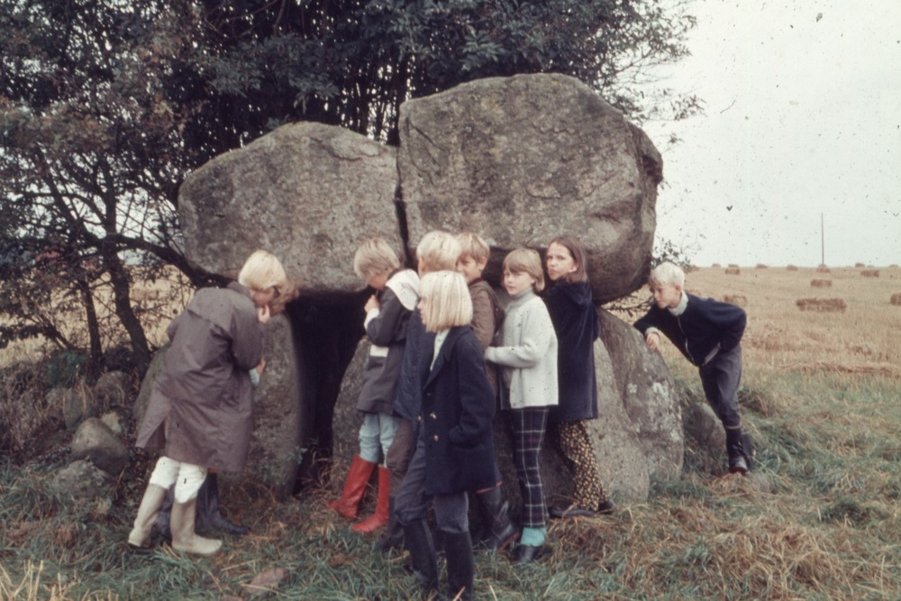 Bilden föreställer en grupp barn runt ett gravröse vid buskar, Gantofta dösen. I bakgrunden åkermark. I bildförteckningen står det Ringstorpssk 1966-1977 "Gravrundan".