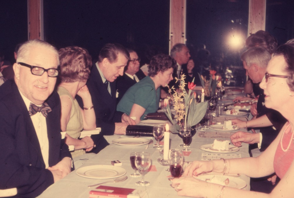 Bilden är från Skol J.F 50 år på Parapeten 1971. Bilden föreställer kvinnor och män som sitter vid dukade bord med vitadukar, blommor, ljus och servis.