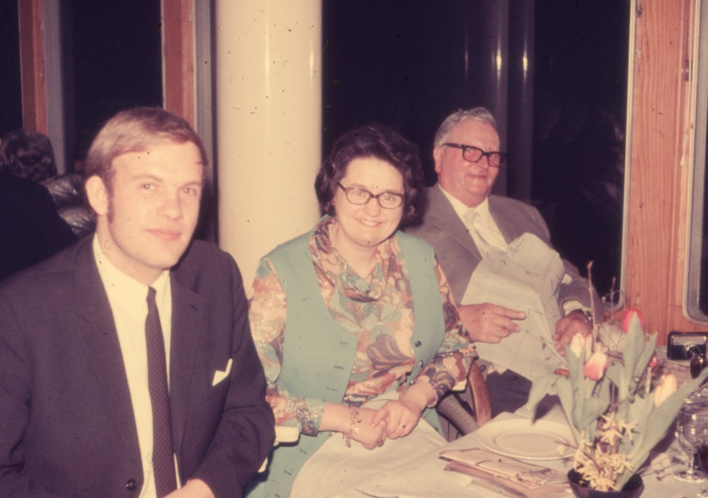 Bilden är från Skol J.F 50 år på Parapeten 1971. Bilden föreställer kvinnor och män som sitter vid dukade bord med vitadukar, blommor, ljus och servis.