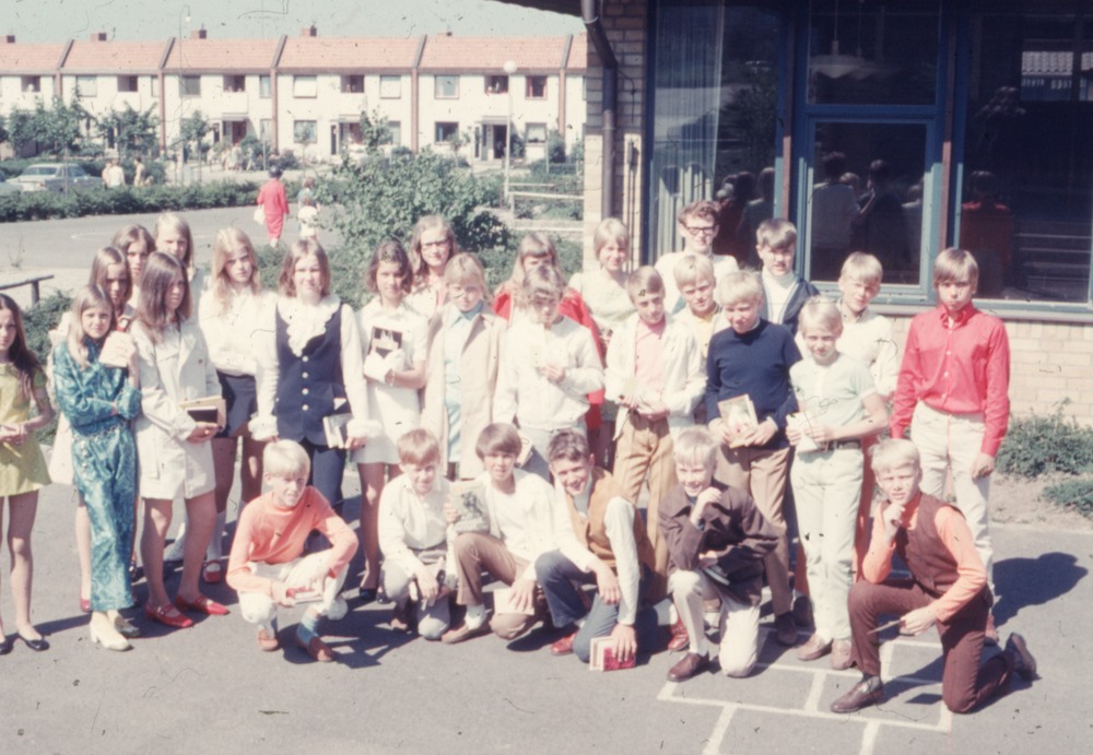 Bilden föreställer Idrotts examen ht 1969 kl 6. Skolbarn uppställda för porträtt på skolgård framför skolbyggnad. I bakgrunden skolgård och radhus.