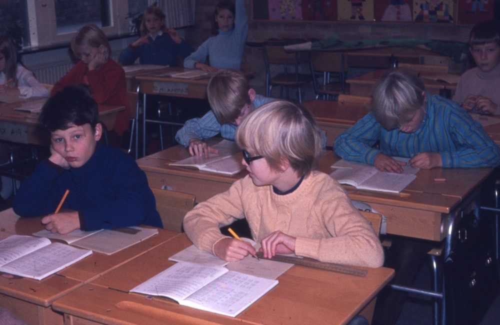 Bilden föreställer i klassrummet kl 4 1969. Skolbarn sitter i sina bänkar i klassrum. Barnen har pennor i händerna och skolböcker och anteckningsböcker framför sig.