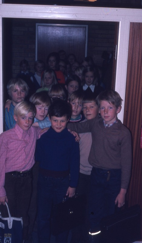 Bilden föreställer i klassrummet kl 4 1969. Skolbarn mest pojkar samlade stående i dörröppning.