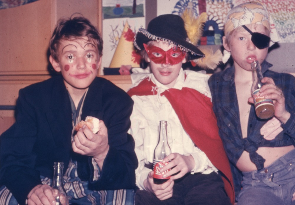 Bilden föreställer enligt register klassfest klass 6 vt 1969. Tre pojkar i maskerad kostym. Dem dricker läsk.
