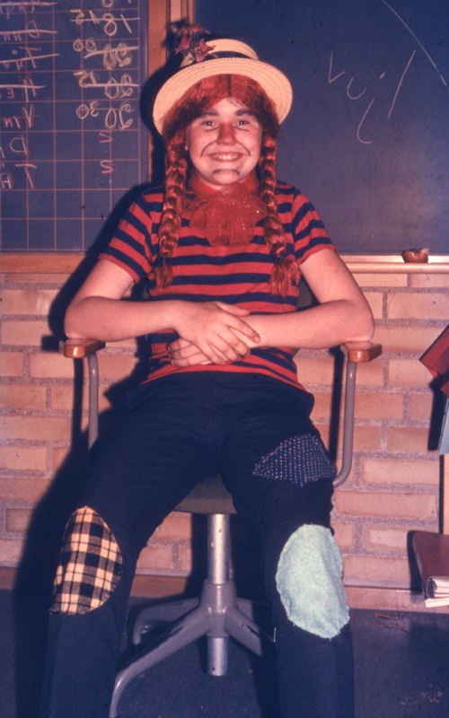 Bilden föreställer enligt register klassfest klass 6 vt 1969. En flicka sitter på en skrivbordsstol. Hon ser ut att ha maskeradklädsel. Hatt, röda flätor, randig tröja och byxor med lappar på knäna.