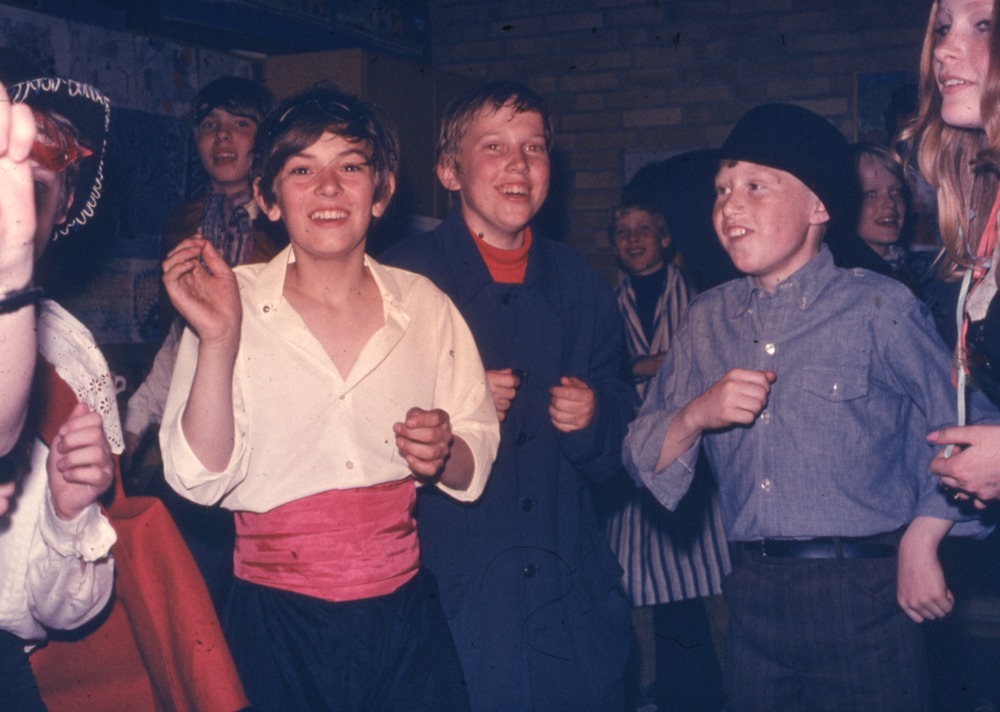 Bilden föreställer enligt register klassfest klass 6 vt 1969. En flicka och två pojkar i trekvartsformat.