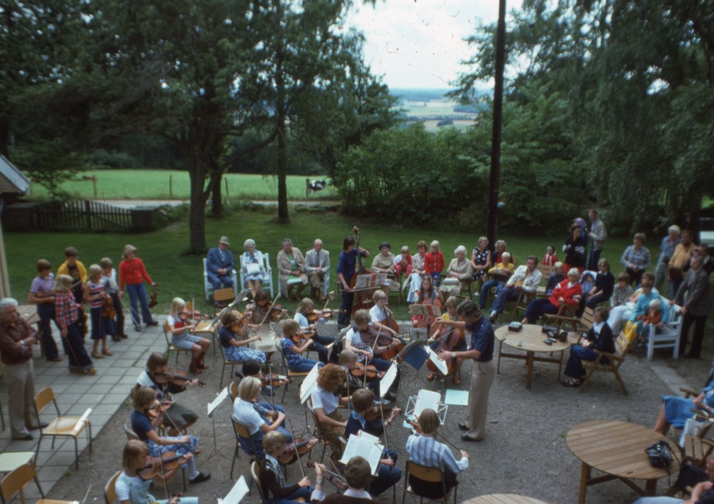 Bilden från kommunala musikskolan Söderåsen 1977, enligt förteckning. Bilden föreställer en orkester med barn som spelar fiol, framför dirigent. I bakgrunden sitter publik i stolar och står. I bakgrunden också gräsmatta och träd.