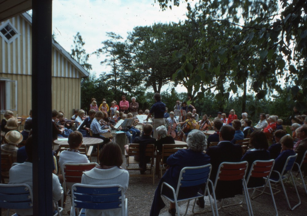 Bilden från kommunala musikskolan Söderåsen 1977, enligt förteckning. Bilden föreställer en orkester med barn som spelar. I förgrunden sitter publik i stolar. I bakgrunden stående människor, träd och byggnad.