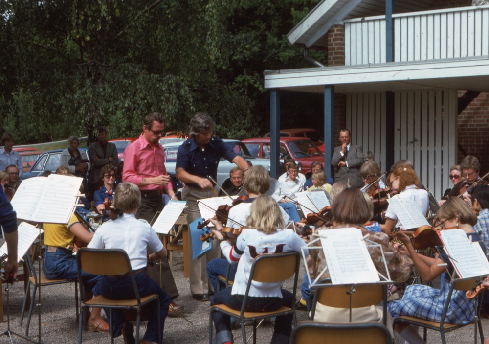 Bilden från kommunala musikskolan Söderåsen 1977, enligt förteckning. Bilden föreställer en orkester vänd från kameran. Eleverna sitter på stolar med sina instrument, fioler. Framför dem notställ. I bakgrunden män, bilar och byggnad.