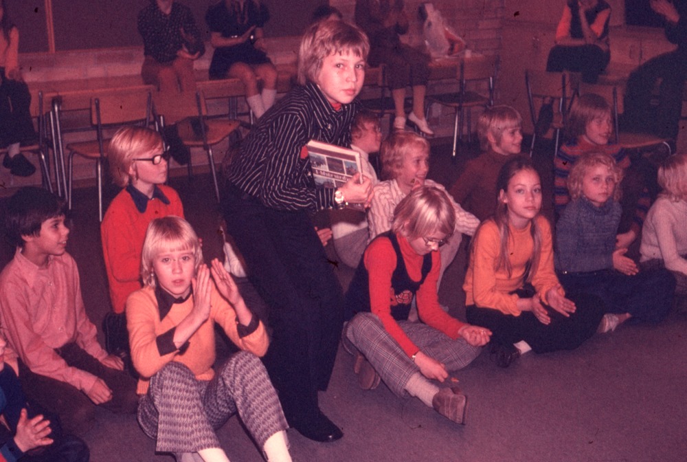 Bilden är från klass 5 ht 1976. Bilden föreställer barn i ett klassrum möblerat för fest. Barn sitter på golv och bänkar vända mot kameran. En pojke står upp och håller en bok i handen. [osäkert]
