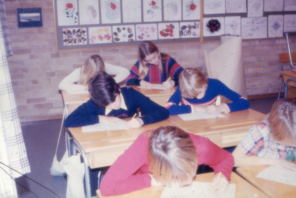 Bilden är från klass 5 ht 1976. Bilden föreställer skolbarn som sitter i sina bänkar med papper och penna i en skolsal.