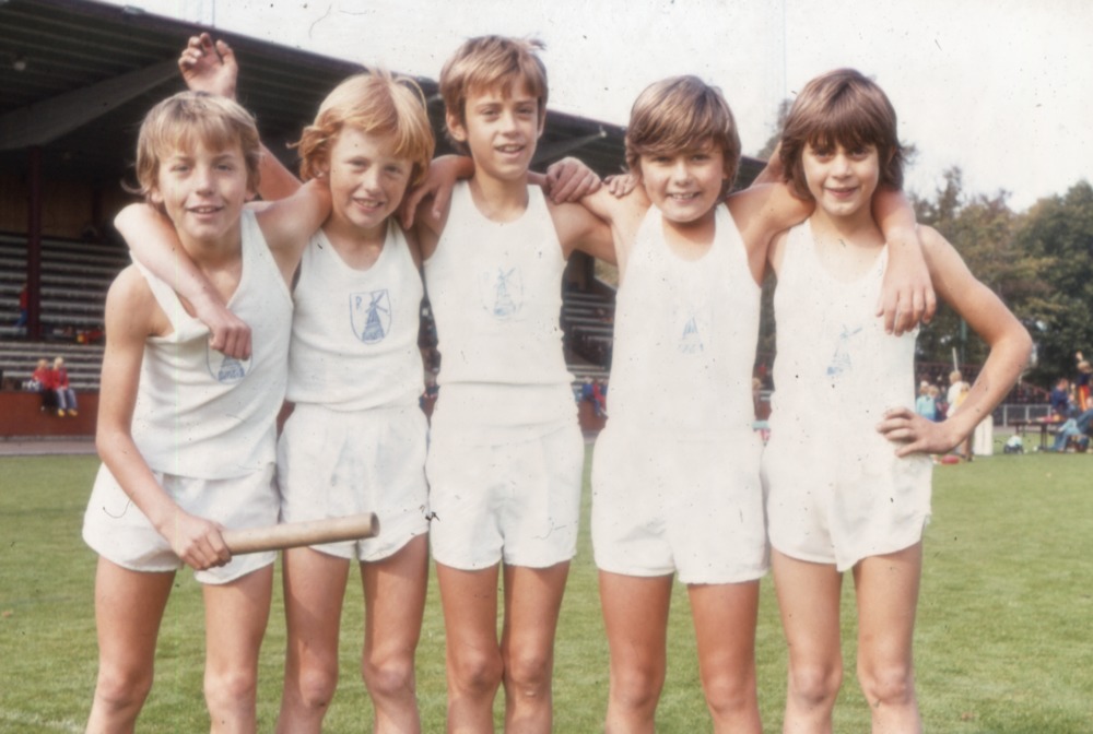 Bilden är från klass 5 vt idrott 1974. Bilden föreställer fem pojkar uppställda för porträttfotografering. De har vita shorts och linne med ett emblem med en mölla och bokstaven R. I bakgrunden idrottsplats.