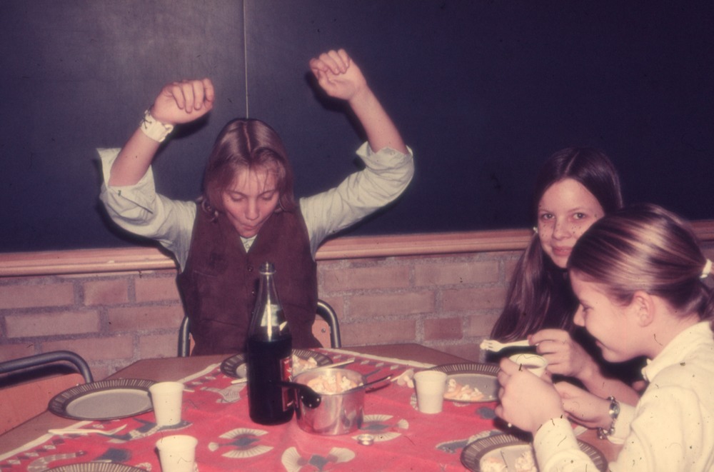 Bilden är från fest för klass 6 ht 1971. Bilden föreställer ett bord med duk, tallrikar, bestick och muggar. Där står en gryta med mat iform av ostkrokar och popcorn samt en flaska med dryck. Vid bordet sitter tre flickor och äter popcorn med gaffel. En flicka gör segergest.