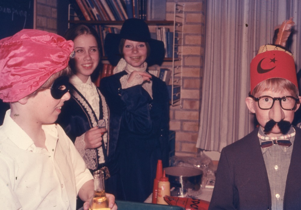 Bilden föreställer enligt register klassfest klass 6 vt 1969. Fyra barn i bröstformat med maskeradklädsel. På ett bord står senap och ketchup. En pojke dricker läsk.