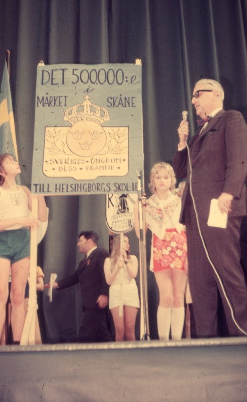 500000:e märket i Skåne till Helsingborgs SKOL-IF" . Mitt på skylten ett vapenmärke med texten "Sveriges ungdom dess framtid". I högerkanten står en man med en mikrofon.