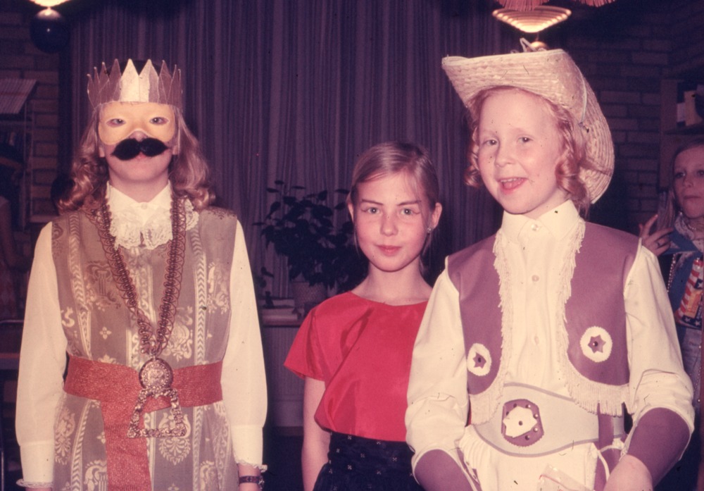 Bilden föreställer klassfest, klass fyra vt 1970. Tre barn i trekvartformat, utklädda.