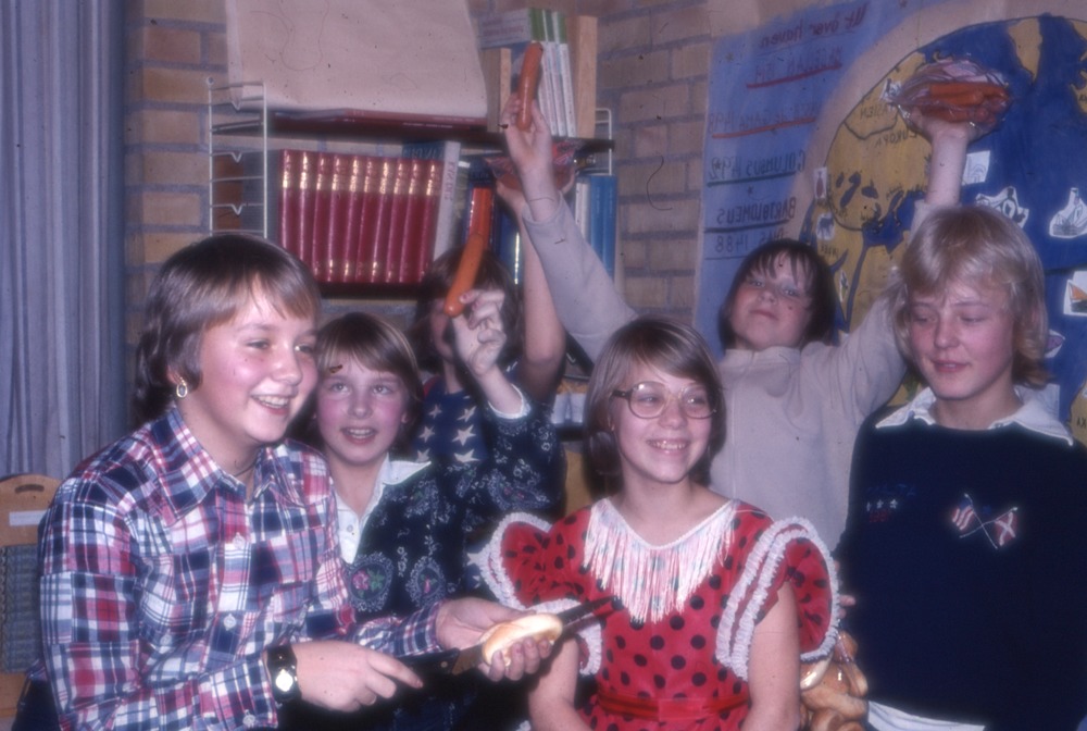 Bilden från klass 5 vt 1977. Bilden föreställer ett grupporträtt på barn, elever, i halvformat. De står i ett klassrum. En pojke delar ett korvbröd med kniv.