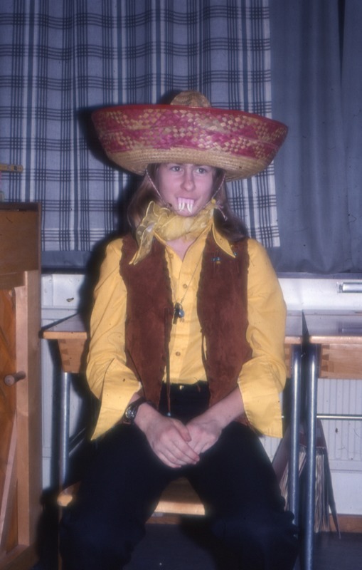 Bilden från klass 5 vt 1977. Bilden föreställer ett porträtt på ett barn, elev, i maskeradkläder. Han sitter i ett klassrum.