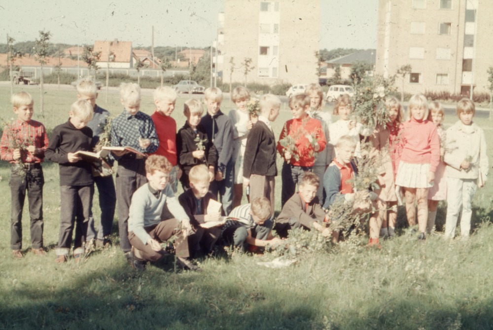 Bilden föreställer en skolklass (klass 4) stående på en gräsyta vid växter de verkar studera. Några barn har böcker i händerna, floror (?). I bakgrunden stadsbebygglese.