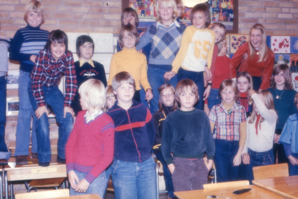 Bilden är från klass 5 ht 1976. Bilden föreställer skolbarn uppställda för grupporträtt. Några barn har klättrat upp och står på bänkarna.