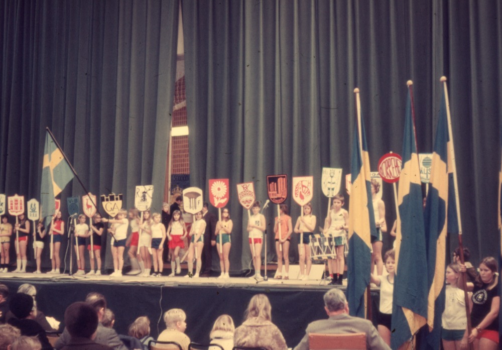 Bilden föreställer Skol J.F. 40 år, 1961. På bild en scen i en gymnastiksal framför svart drapperi. På scenen står pojkar i shorts i en rad de håller i vapensköldar. I framkanten åskådare.