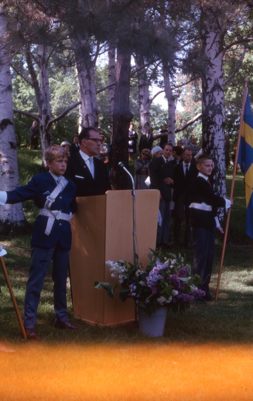 Bilden föreställer skolavslutning, examensavslutning i Grytan för Slottsvångsskolan 1964. Vid ett podium bland träd står en man och håller tal. Mannen är rektor Thor A han flankeras av två pojkar med någon form av bälte. I bakgrunden åhörare.