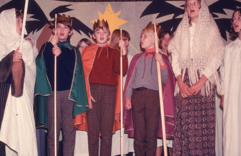 Bilden föreställer en teaterföreställning där barn spelar ett julspel, historien om Jesufödelse. Tre pojkar med krona på huvudet och stav i handen. På sidorna två flickor med sjal över huvudet. På fotot står det julen 1967, klass 5.