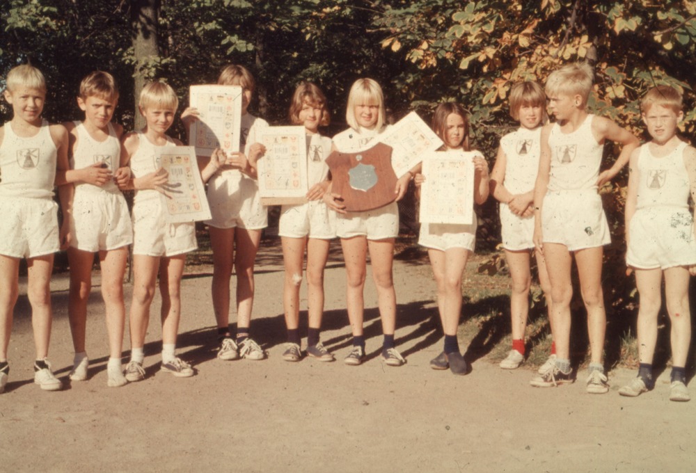 Bilden föreställer en rad med flickor och pojkar i vita linne och vita shorts. De har ett emblem på tröjan iform av en mölla och bokstaven R. Fem barn håller i varsitt diplom. En flicka håller i en vapensköld med en metall plakett. De står på en grusyta med träd i bakgrunden. På bilden står det klass 4.