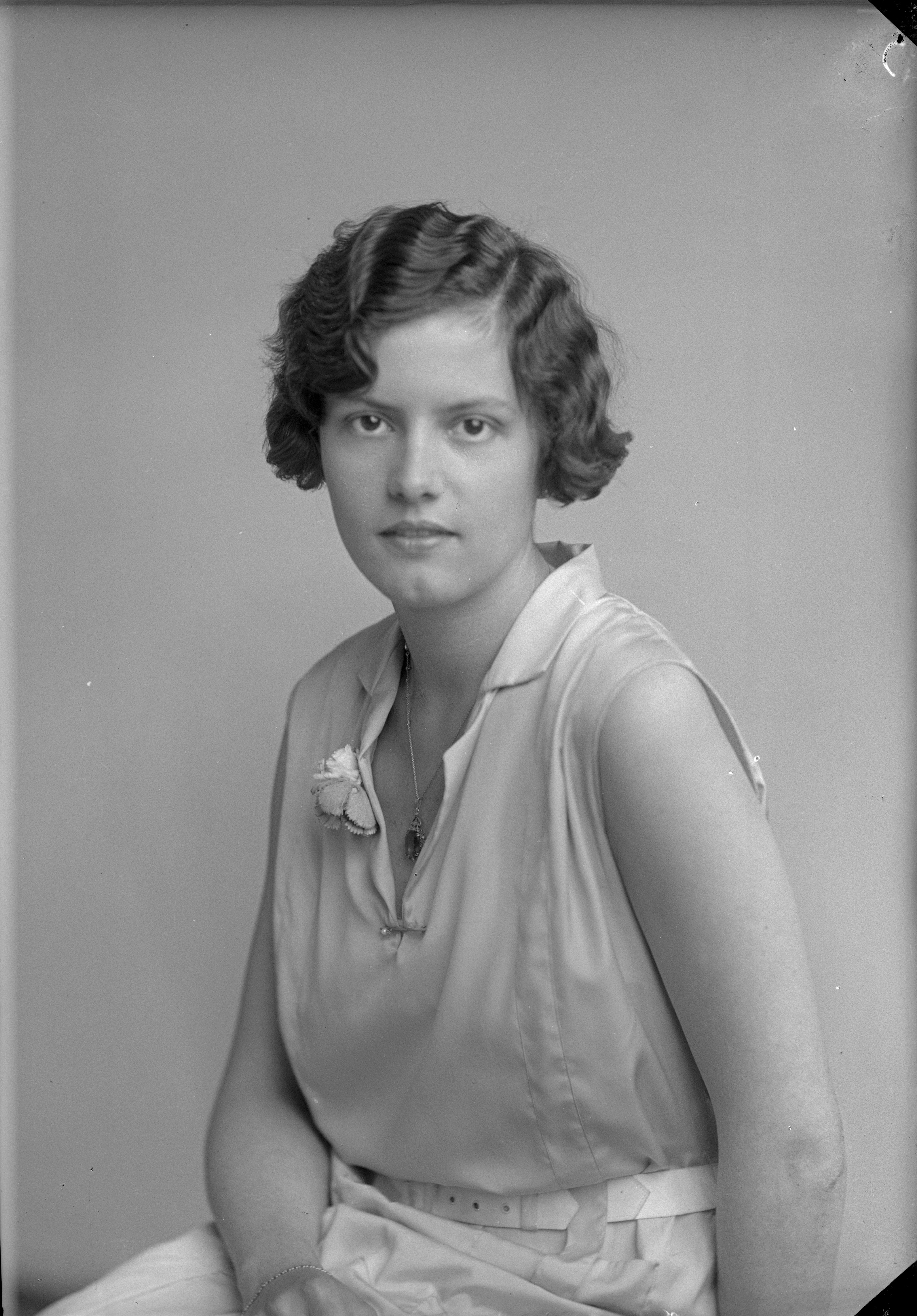 Beskrivning: Porträtt i halvfigur av Thea Persson.