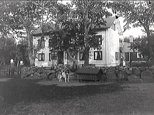 Exteriör av mangårdsbyggnaden på Tranebergs gård. I bakgrunden syns en lägre byggnadslänga och framför stengärdsgården står en hund vid sin hundkoja.
