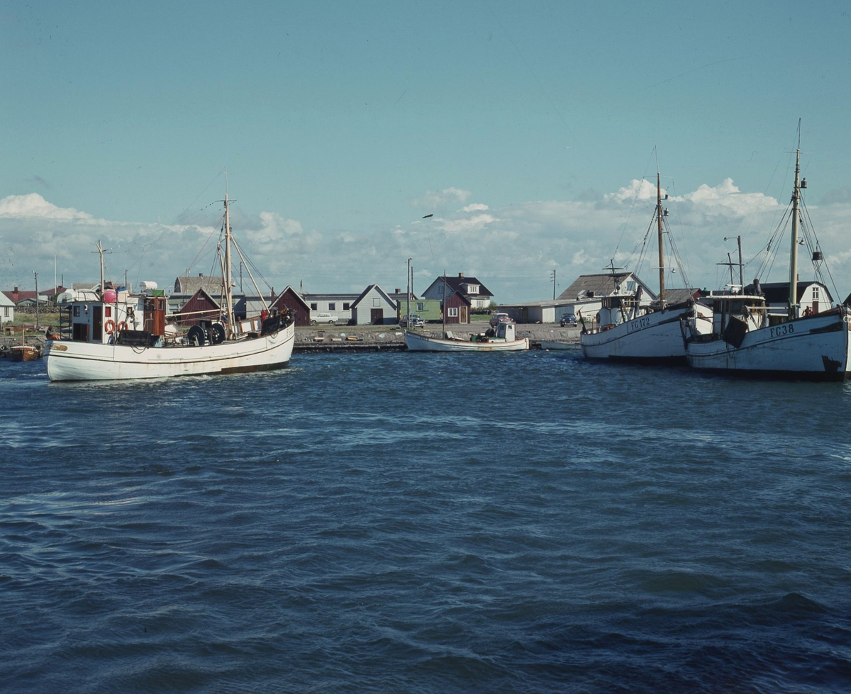 Glommens hamn med fiskebåtar och fiskebodar. Bybebyggelse med villor och ekonomibyggnader i bakgrunden.