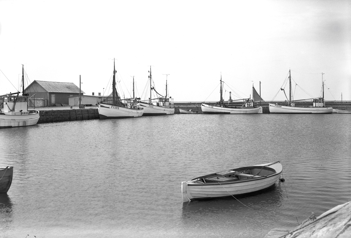 Glommens hamn med fiskebåtar vid kajen och hamnmagasin. Mindre båt i förgrunden med roder.