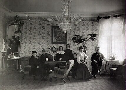 Interiörbilder från Samuelssonska villan i Varberg. Villan uppfördes 1904 vid korsningen Lasarettsgatan-Västra Vallgatan till stadsfiskal Nils Olof Samuelsson (1864-1910). Sannolikt är det han med maka och barn i salongen på bild 1. Ritningarna gjordes av byggnadsingenjören Gottfrid Ljunggrens och var ett av hans första byggprojekt sedan han kommit till staden året dessförinnan. 1945 flyttade provinsialläkare Karl-Holger Hejll med familj in i huset vilket ledde till att det senare kom att bli mer känt som Hejllska huset.