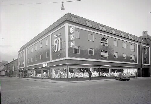 Varuhuset EPA i hörnet Kungsgatan - Borgmästaregatan i Varberg. På ena fasaden står "Filial 50".