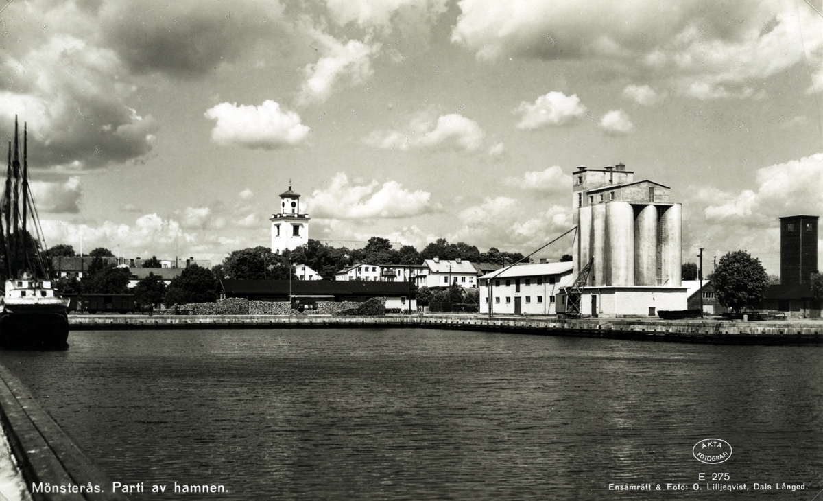 Kyrkan och en spannmålssilo vid hamnen i Mönsterås.