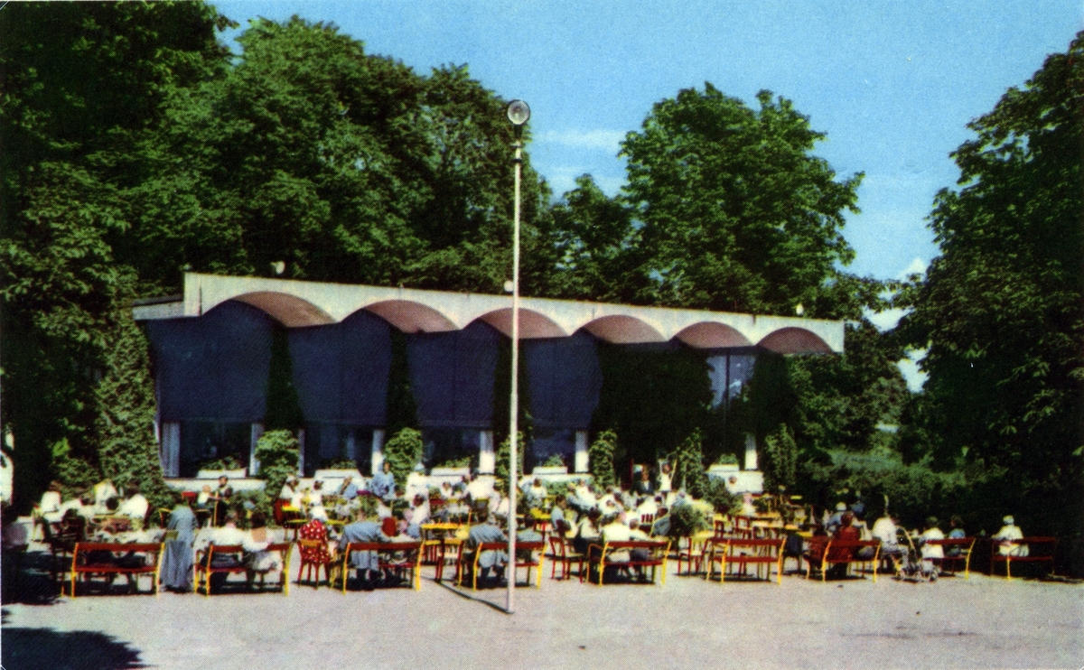 Vykort visande ätande gäster på stadsparksrestaurangen "Byttan" i Kalmar stadspark.