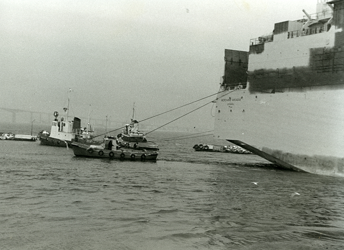 En båt som baxar in fartyg till kaj. Vid Elevatorkajen.