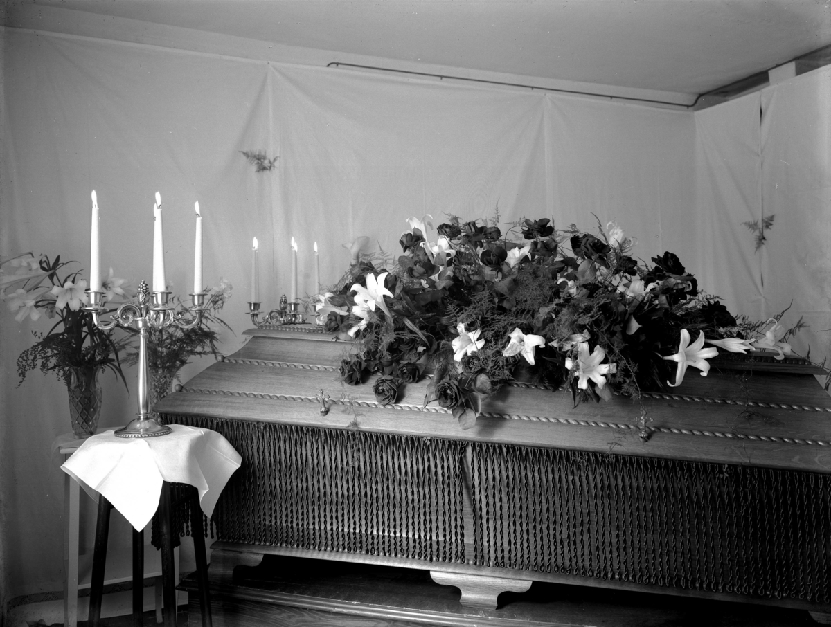 En kista med kistdekorationer. Enligt Walter Olsons journal är bilden beställd av fru J alb. Johansson ifrån Norra vägen 44.