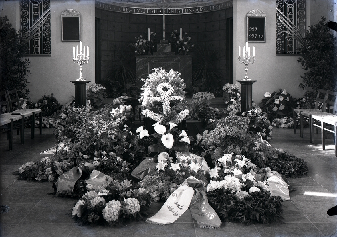 Begravning i gamla Krematoriet, nuvarande Skogssalen på Norra Kyrkogården. Ur Walter Olsons negativsamling.