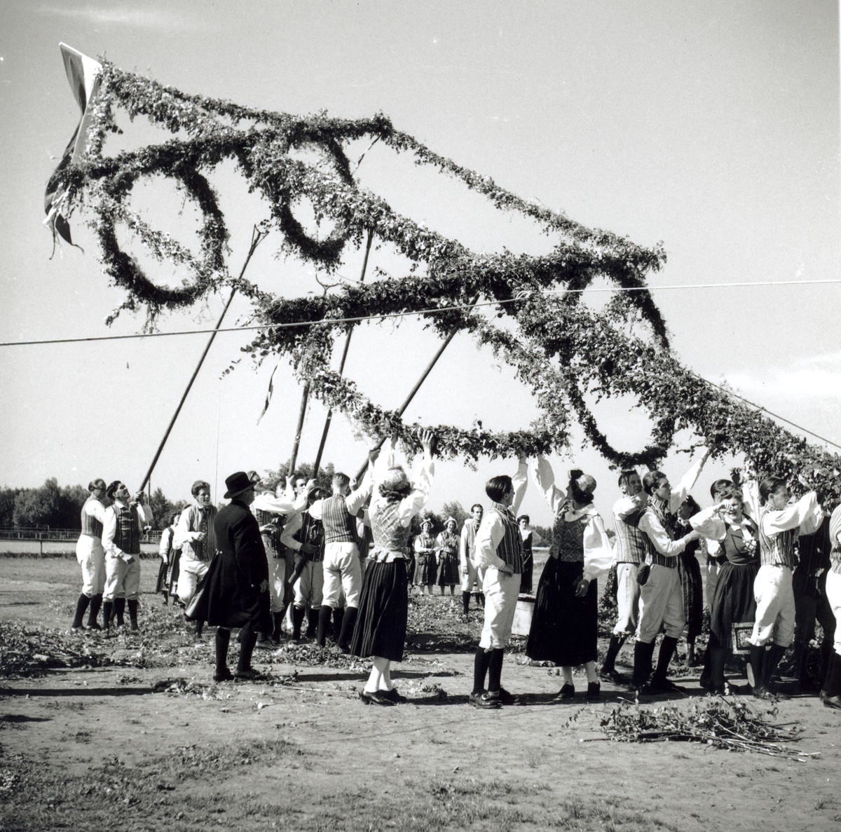 Resning av midsommarstången vid hantverksmässan i Kalmar 1947.